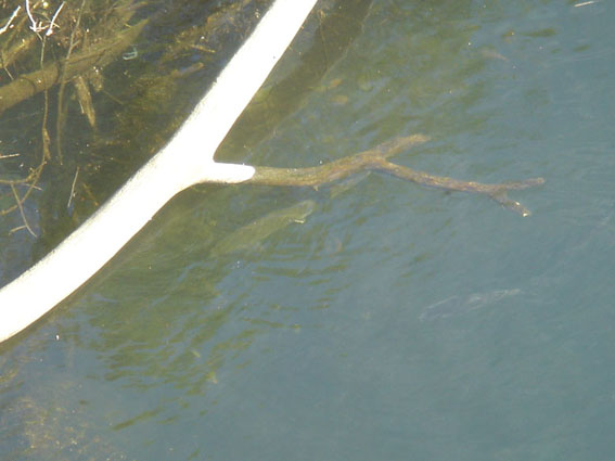 En la secuencia de fotos que aparecen arriba, se puede apreciar cual puede ser el destino actual de un salmón en el río Verdugo. En la primera vemos un salmón junto a un mujel, que acaba de entrar en el sistema fluvial Verdugo-Oitavén (se encuentra muy cerca de la desembocadura, común a los dos ríos). En la segunda vemos un salmón gravemente herido por arpón de fusil subacuático, y en la tercera y última, ese mismo salmón muerto.