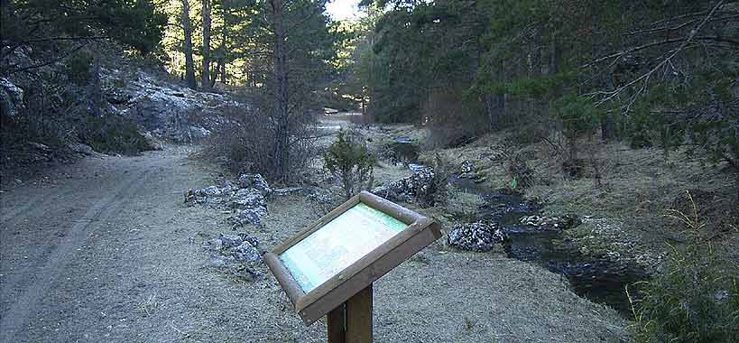 Damos un paseo por este cauce encajonado por donde circula un hilito de aguas, donde aparecen abrigos (cueva de los campanos) acondicionados que acogieron ganado antaño que permanecía sedentario. Puentecillos de madera y paneles informativos recientes nos acompañarán por una pista ancha, que se interna entre pinares muertos de frío, que se quieren acercar al caminante para entrar en calor.