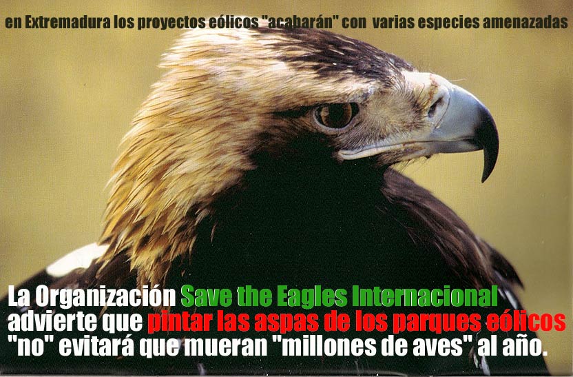 Save the Eagles International (STEI) desea advertir a la comunidad internacional sobre la amenaza a la biodiversidad representada por los parques eólicos y sus lineas de evacuación. A diferencia de los automóviles, edificios, y gatos domésticos, las aspas de los molinos y las líneas de alta tensión con frecuencia matan aves protegidas o en peligro de extinción, tales como águilas, grullas, cigueñas, etc. Considerando estas pérdidas acumulativamente y a largo plazo, los 3,5 millones de aerogeneradores que serán instalados en el mundo causarán la extinción de numerosas especies de avifauna, algunas de ellas emblemáticas.