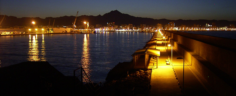 El puerto de mercancías y las vistas a las extensas vistas hacia el norte, de arenas con las playas que miran hacia el montículo de Cullera.
